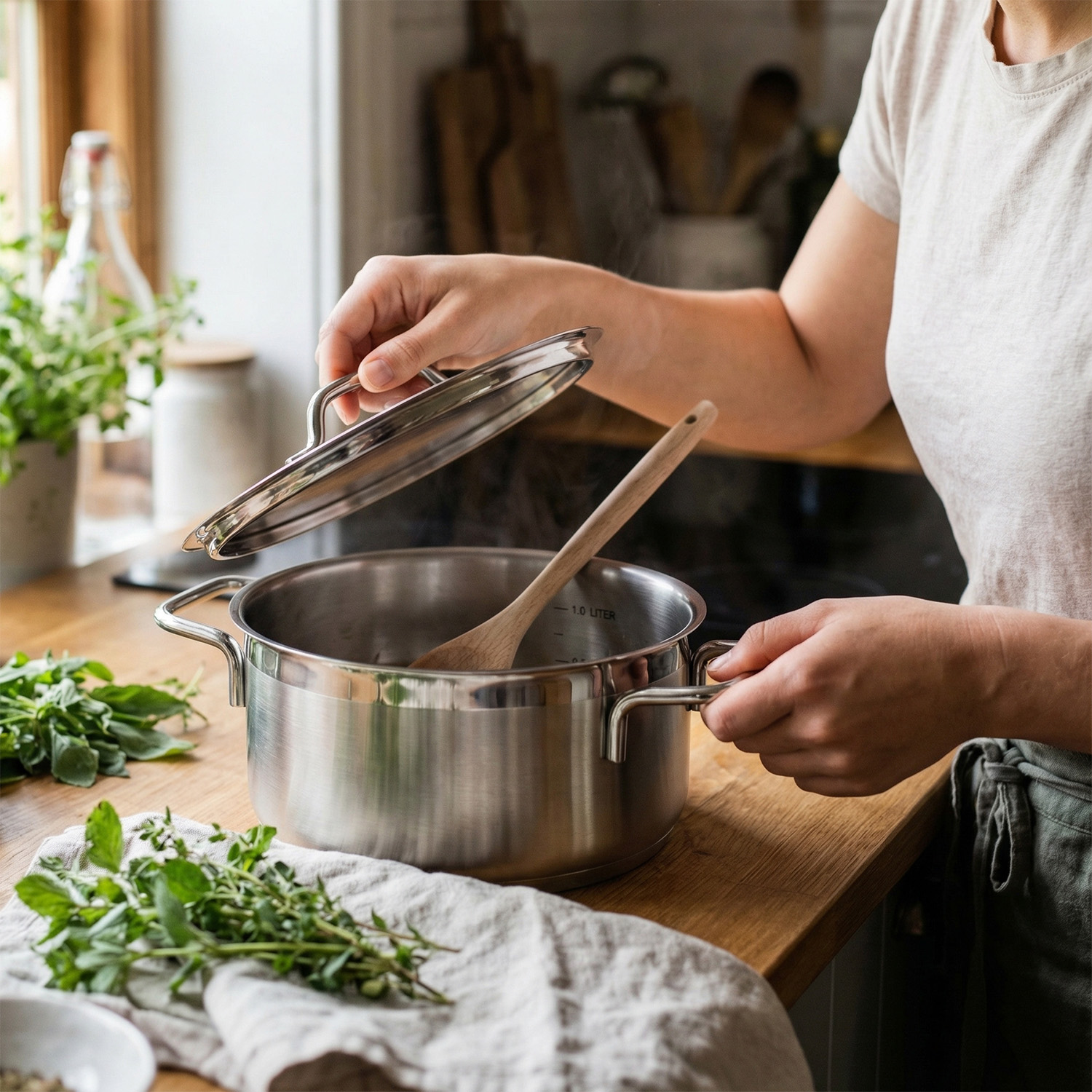 Its sandwich bottom is composed of three materials. The 18/10 stainless steel inner side guarantees a safe and hygienic food contact surface that is low maintenance. The high-quality aluminium core ensures fast and optimal heat distribution. The bottom layer is made of magnetic chrome steel, which allows use on all types of heaters, including induction. The lid is made of the same material as the inner surface.